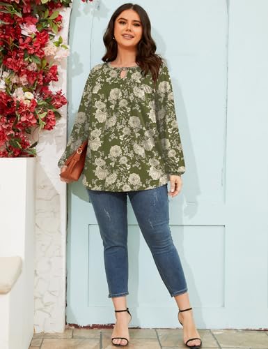 TFSDOD Women Plus Size Tops Long Sleeve Shirts V Neck Pleated Keyhole Blouse Loose Work Tunic Tee 1X-5X 6
