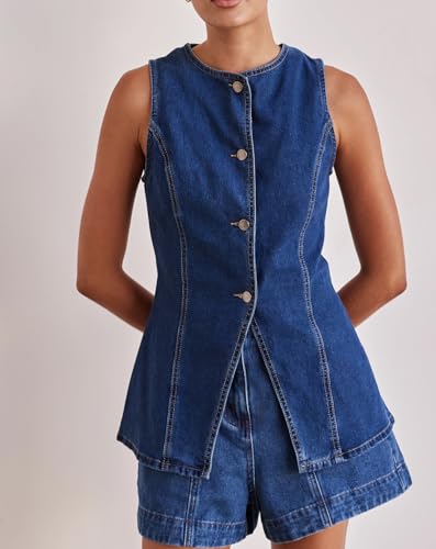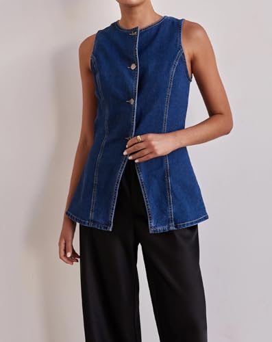 HOT ! Women’s Long Denim Vest Waistcoat Vest Sleeveless Button-Up Back Slit Jean Jacket Vest Y2k Clothes