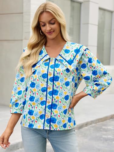 Cicy Bell Womens Floral Button Down Shirts Trendy Casual 3/4 Lantern Sleeve Blouse Square Neck Collared Tops 7