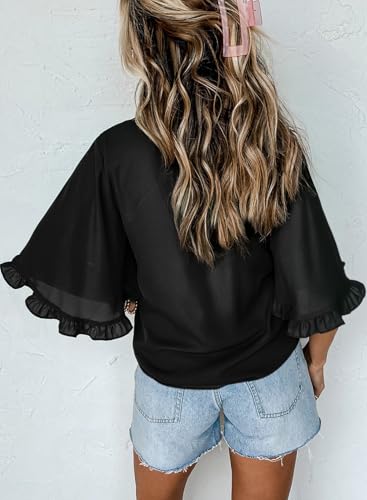 EVALESS Summer Outfits for Women Crewneck Bell Sleeve Tops with Ruffled Trim Cute Shirts Casual Loose Fit 2025 3