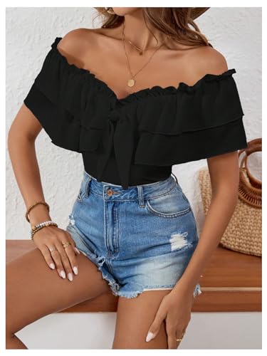MakeMeChic Women's Off The Shoulder Tops Short Sleeve Tie Front Ruffle Layer Tee Shirts Blouse 1