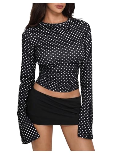HOT ! Milumia Women's Polka Dots Bell Sleeve Crop Tee Top Y2K Ruched Slim Fit Going Out T Shirt