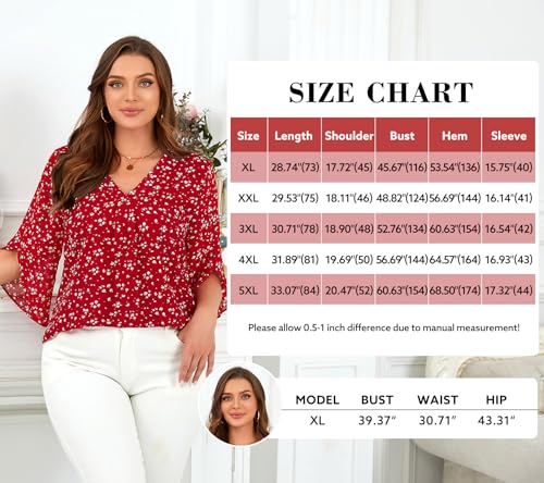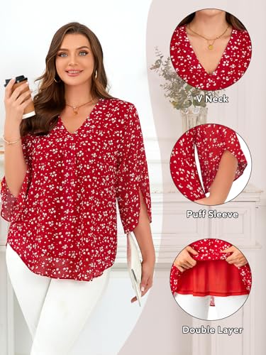 Siddhe Womens Plus Size Tops 3/4 Sleeves Chiffon Blouses Dressy Casual Fall V Neck Loose Fit Double Layers Shirts(XL-5XL) 3