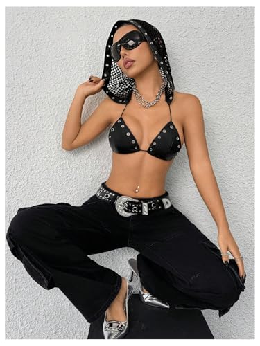 • Features: Sexy y2k punk gothic crop top, triangle cups, fishnet hood, grommet eyelet embellished, sleeveless, sexy micro crop top, sexy rave club outfits