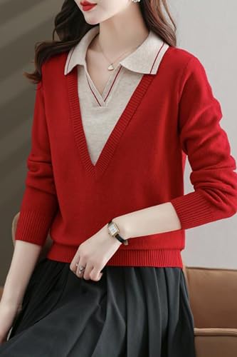 More information about LAI MENG FIVE CATS Women's Polo Contrast Collar Sweater Casual Ribbed Knit Shirt V-Neck Tunic Pullover Top