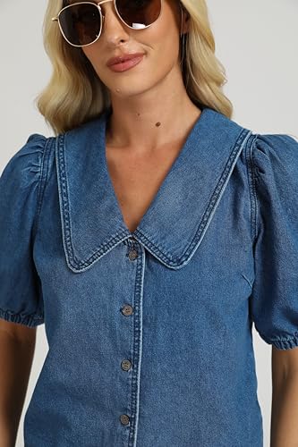 Womens Denim Shirts Button Down Collar Puff Short Sleeve Casual Lightweight Summer Jean Shirt Tops 5