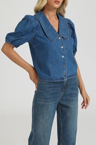 Womens Denim Shirts Button Down Collar Puff Short Sleeve Casual Lightweight Summer Jean Shirt Tops 6