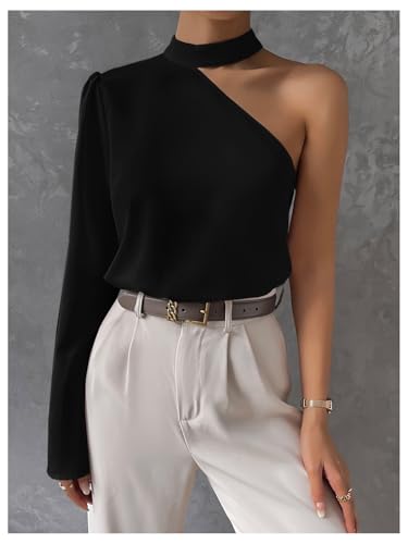 HOT ! Verdusa Women's Solid Asymmetrical Neck Halter Long Sleeve Tops One Shoulder Bell Sleeve Blouse