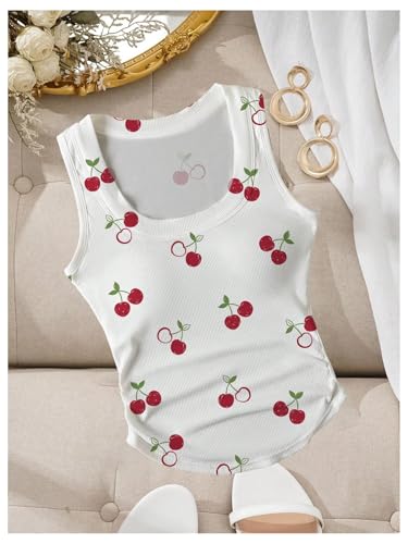 WDIRARA Women's Cherry Print Curve Hem Tank Top Sleeveless Scoop Neck Rib Knit Shirts 5