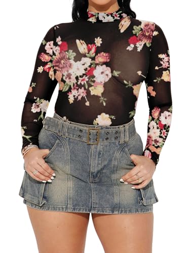 HOT ! Womens Mesh Sheer Tops Long Sleeve Mock Neck Sexy See Through Shirts Floral Blouses Y2k Layering Top