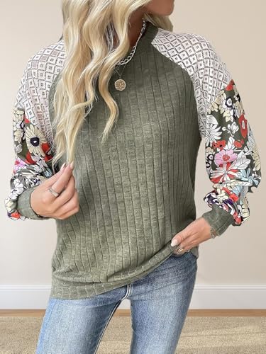 SKVON Floral Tops for Women Patchwork Long Sleeve Ribbed Blouses Crewneck Striped Crochet Print Shirts Lace Knit Sweaters 3