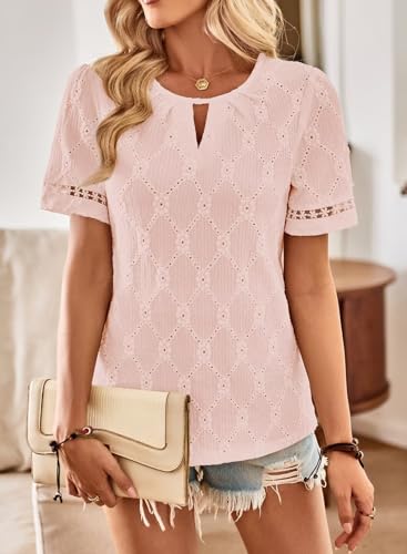 Womens Summer Tops Keyhole Crew Neck Eyelet Lace Short Sleeve Blouses Boho Casual Hollow Out Embroidered Shirts 4