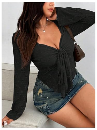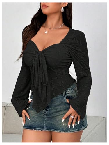 • Features: Womens plus size tops feature a v neck, long sleeve, slim fitted, bow tie front, asymmetrical hem, solid color, cropped length, casual