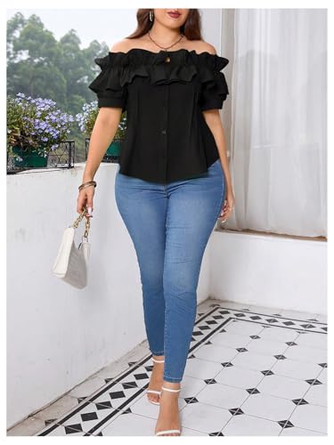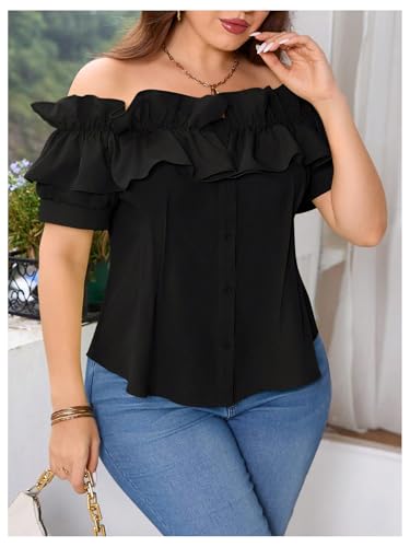 MakeMeChic Women's Plus Size Blouse Off The Shoulder Short Sleeve Ruffle Button Down Shirt 6