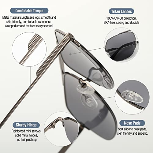 • 【New Half-Frame Design】- Semi-frame aviator sunglasses are made up of new upgraded technical process and solid splicing process. Unbreakable metal frames, sturdy metal hinges and all the details ensure you get long lasting use. Simple irregular aviator design is a fashionable business accessories suitable for any occasions.