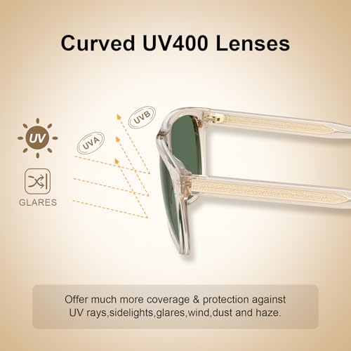 • Acetate Translucent Frame Men's Sunglasses - Our sunnies are made of Italy handpolished acetate material. Compared with cheap peeling plastic frame whose color are sprayed on, our glossy frame retains color brightness impeccably over time because its hue is natively embedded in material. So avoid from fading, peeling, yellowing or other discoloration. Hypoallergenic aceteate also resistant to sweat corrosion, ensure skin health during outdoor activities.