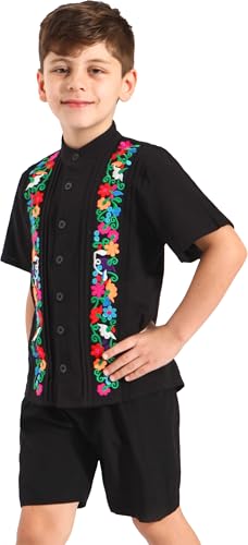 • Bold Traditional Style for Kids – This black Guayabera shirt brings Mexican cultural fashion to life with eye-catching floral embroidery and classic structure.