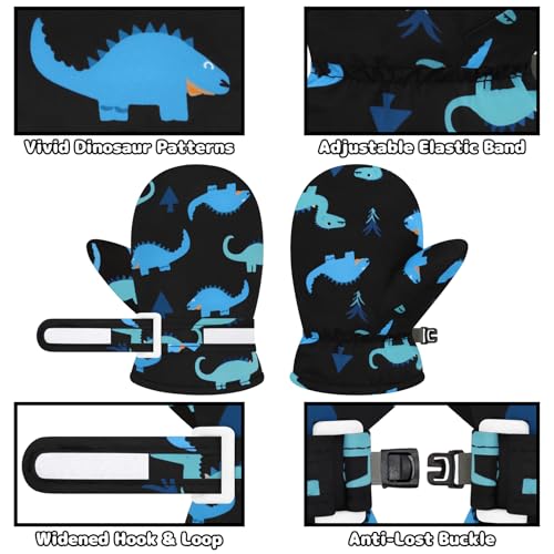 • UNIQUE PATTERNS & ANTI-LOSS DESIGN: Come in various vivid dinosaur patterns, these toddler mittens not only can stimulate our baby's curiosity and encourage them to explore the outside world, but also cater to their different preferences and are easily paired with various winter clothes. Besides, our baby winter mittens are equipped with an anti-loss buckle that allows the two toddler waterproof gloves to be connected, making them easier to carry and greatly reduces the risk of loss.