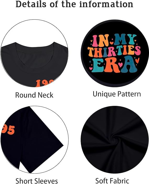 • 【In My Thirties Era T-shirt】: Classic crew neck design, IN MY THIRTIES ERA letter printed on the back while 1995 in front, cute heart graphic tees, normal style, short sleeve tee tops