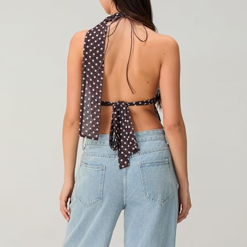 HOT ! Women Polka Dot Halter Top Y2k Backless Cami Tank Tops with Scarf