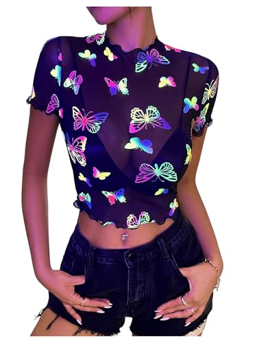 SHENHE Women's Sheer Mesh Reflective Rave Top Y2k Butterfly Round Neck Short Sleeve Crop Top 6