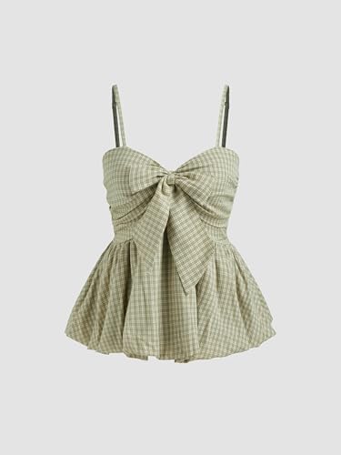 CIDER Plaid Shirts for Women Check Shirred Knotted Cami Top Sleeveless Bubble Hem Cute Blouse Going Out Top 7
