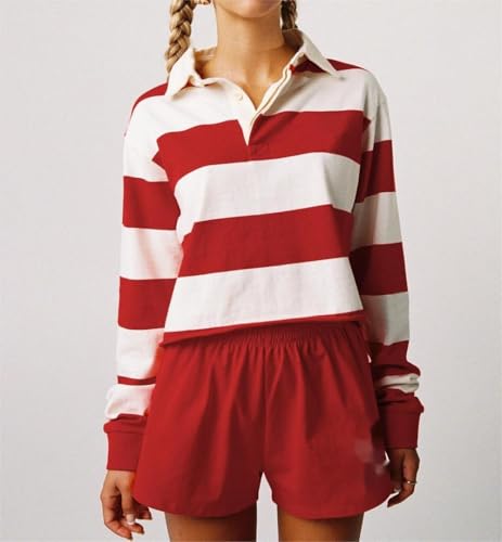 Women Striped Oversized Polo Shirt Long Sleeve V Neck Pullover Sweatshirt Color Block Lapel Collar Rugby Shirt 5