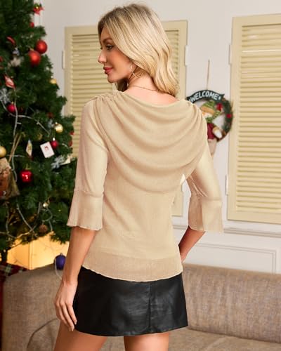 Lotusmile Blouses for Women Dressy Casual 3/4 Sleeve Cowl Neck Sparkly Tops Cocktail Shirts for Evening Party 3
