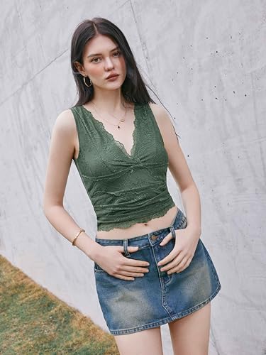 HOT ! CIDER Lace Crop Tank Tops for Women Summer V Neck Sleeveless Going Out Tops Ruched Sexy Tee Trendy T Shirts Casual