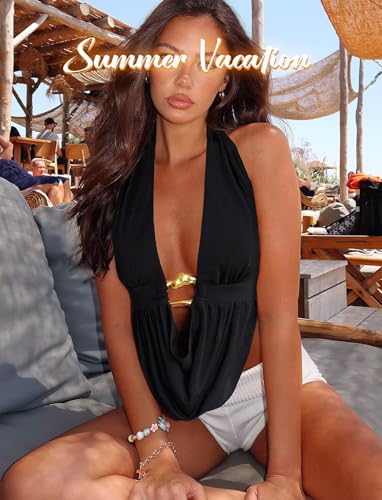 • ❤ Design highlights: Halter v-neck tank tops for women, low cut draped front, metal ring decoration and sexy backless which is so cute and eye-catching. Trendy and elegant open back crop tops for women upgrade any look