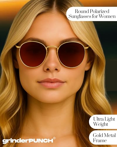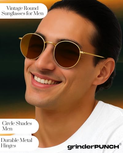 HOT ! grinderPUNCH Classic Retro Sunglasses for Women Men, UV400 Protection Lens and Lightweight Men Sun Glasses Small Circle Metal Frame (Rose Gold Metal Frame/Brown Lens)