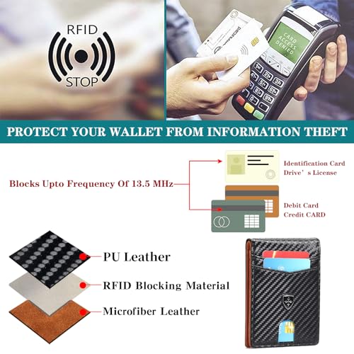 • Modern Design & Sturdy Construction: This minimalist wallet for men features the latest waterproof carbon fiber leather cover. Compared to traditional leather wallets, the slim wallet for men is more compact and sleeker, convenient carrying in front pocket, and the carbon fiber leather makes it more durable.