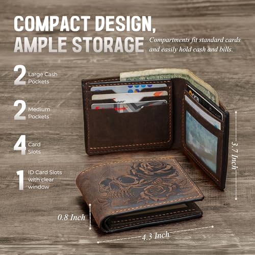 • Unique Design: This wallet features an eye-catching skull and rose pattern embossed into the genuine leather exterior.