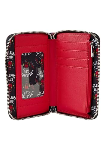 • The Loungefly Netflix Stranger Things Eddie Munson Tribute Zip-Around Wallet is made of vegan leather (polyurethane). Wallet zips closed with silver-colored metal hardware. Additional features include applique, debossed, glow-in-the-dark, and printed details. Take note of the coordinating inside lining.