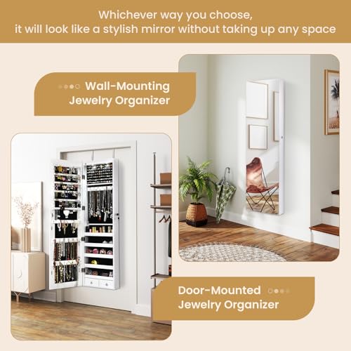 NAFORT 2 LEDs Mirror Jewelry Armoire, 47.5" H Door or Wall Mounted Jewelry Cabinet with Frameless Mirror, Lockable Jewelry Storage Box, Hanging Jewelry Organizer with 2 Drawers, White 6