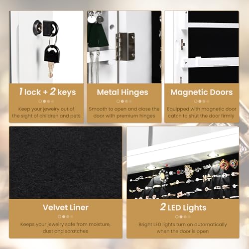 • 【Lockable Jewelry Organizer with Lights】This mirrored jewelry box comes with a lock and 2 keys to keep children out, and the door closes securely with magnetic closures to prevent unwanted opening. Besides, the 2 LED lights turn off automatically when the door is closed and on when the door is opened (2 LED lights are powered by 2 AA batteries, NOT included).