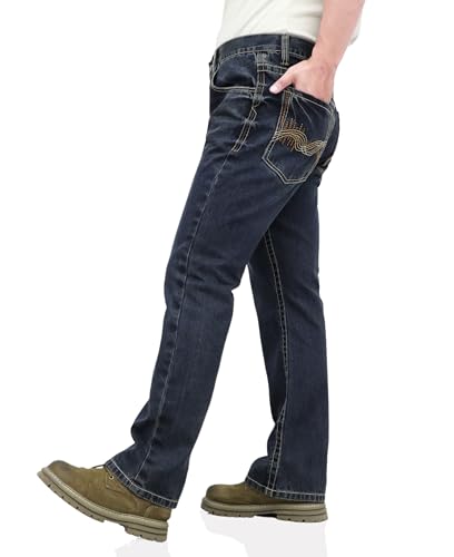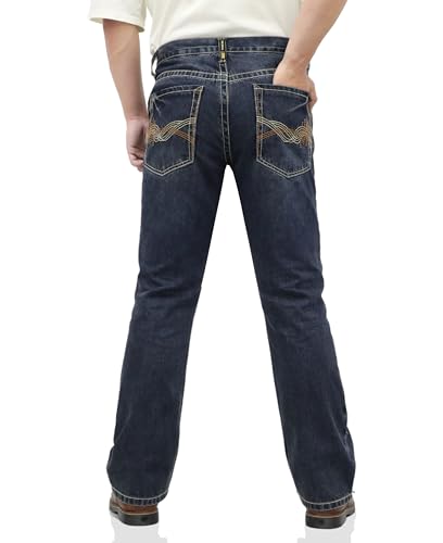 • RELAXED FIT BOOT CUT:BOCOMAL bootcut jeans are relaxed through the waist,hip and thigh for A comfortable fit,fits over boots(because of the heavy stone washed,the size now on a smaller between size/waist 1"smaller,recommend buy one size up if want more room,will fix this soon)
