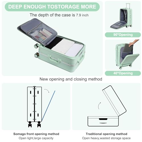 More information about Somago Carry on Luggage Front Open 22x14x9 Airline Approved Lightweight Suitcase with Cup Holder and USB Port Aluminum Frame Polycarbonate Spinner Hard Suitcase with TSA Lock (Lime)