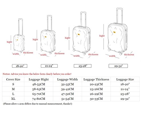 • Fit quickly and easily in seconds. Durable and washable, 4 sizes available to fit almost any luggage. S: fit 18-20 inch luggage, M: fit 21-24 inch luggage, L: fit 25-28 inch luggage, XL: fit 29-32 inch luggage.