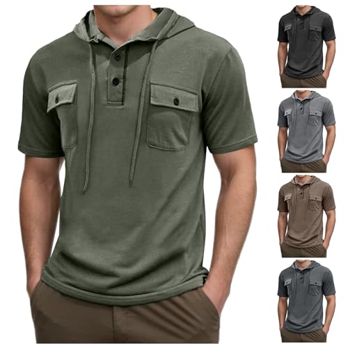 Mens Short Sleeve Hooded T Shirts Casual Drawstring Pullover Hoodies Fashion Lightweight Button Shirts with Pockets 1