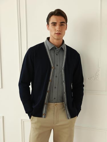 100% Merino Wool Sweater Cardigan for Men Buttons Contrast Placket Two Pockets Casual Long Sleeve Knit Tops 3
