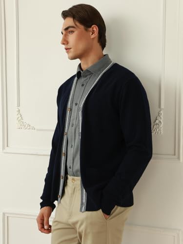 100% Merino Wool Sweater Cardigan for Men Buttons Contrast Placket Two Pockets Casual Long Sleeve Knit Tops 5