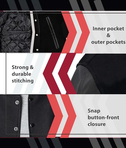 • [Premium Quality] Our men's varsity jackets are an ideal piece of outerwear for winter. These vintage bomber jackets men have a plain black front with leather sleeves which make them suitable for daily wear. In order to ensure their durability & comfort, we have crafted our vintage varsity jackets from high quality 100% pure wool & thick cowhide grained leather. In addition, there is a thick & warm polyester lining on the inner side which makes our black letterman jacket, cozier and comfortable.