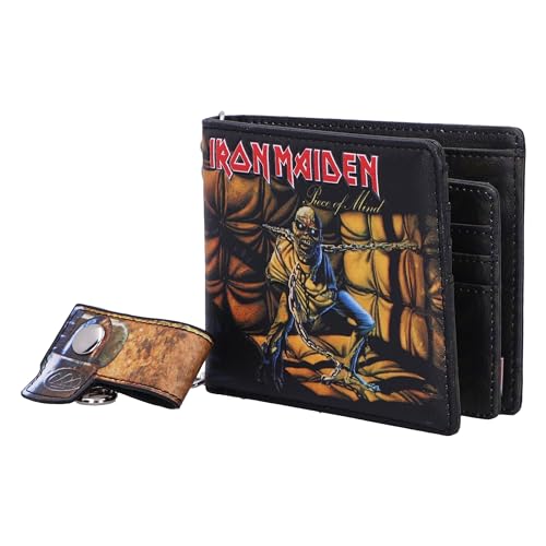 • Iron Maiden Piece of Mind Album Wallet: Encapsulating the spirit and energy of Iron Maiden's Piece of Mind album, this wallet features the band's mascot Eddie, leaning forward, restrained by a straightjacket and chains, surrounded by padded walls to resemble that of an asylum