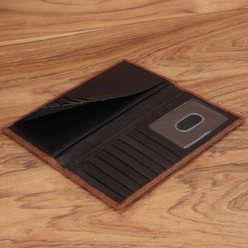 • ✅ Slim Long Bifold Design - Features 9 card slots, 4 full-length cash/receipt pockets, a clear ID window with thumbhole for quick access, and camouflage canvas lining in the vertical cash pockets; measures 3.5" (L) x 6.9" (H) and handcrafted from premium full grain leather.