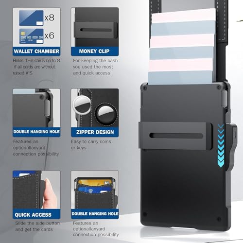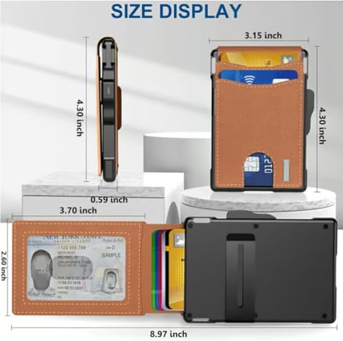 • Enough Space: 12 Cards can be inseted in this lightweight and compact wallet, with 3-4 additional cards (1 ID windows included) in the cover, another 6 cards can be stored in the aluminum champer of the wallet, 1 or 2 cards can be inserted in outside of the aluminum champer. A money clip on the inside of the card holder helps you store cash, while an automatic card slot allows you to remove credit cards or ID cards faster.