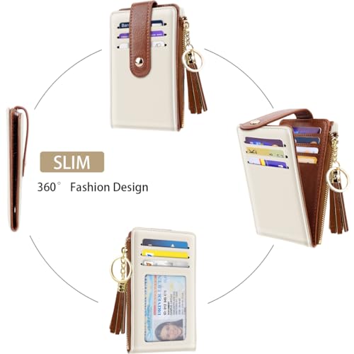HOT ! Bifold Wallet RFID Credit Card Wallet Card Holder for Women or Men with Keychain Zipper Pocket with Tassel Zipper Coin Pockett,Cream
