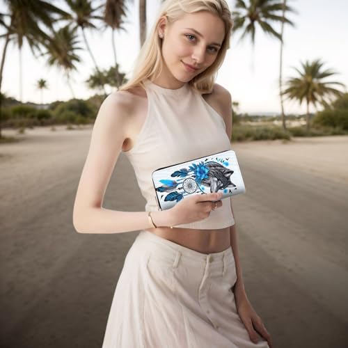 Wallet,Large Capacity RFID Blocking Leather Wallet, Durable Smooth Zipper Clutch,Unisex Travel Wallet for Cards,Cash,and Coins,Dream Catcher Wolf 1