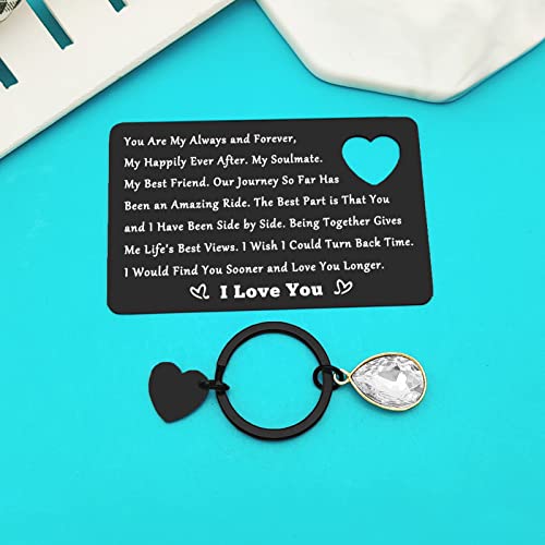 • Wallet Card for Him: Engraved with sweet words “You are my always and forever,my happily ever after.my soulmate.my best friend.Our journey so far has been an amazing ride.The best part is that you and I have been side by side.Being together gives me life's best views.I wish I could turn back time.I would find you sooner and love you longer.I love you.” with an additional cutout keychain.