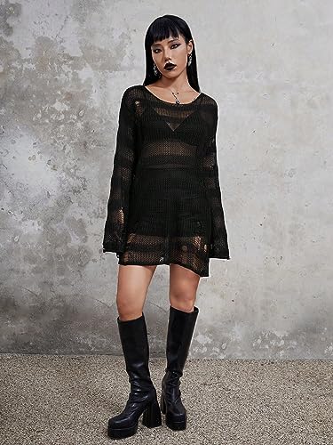 HOT ! Verdusa Women's See Through Round Neck Drop Shoulder Sweater Long Flare Sleeve Knit Top